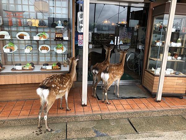 嚴島除了神社以外,另一個特色就是路上有不少鹿,但這裡的鹿跟奈良的不一樣喔!