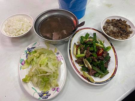 一碗小牛肉湯附贈牛肉肉燥飯(100元)+一碗白飯(10元)+蔥爆牛肉(150元)+清炒高麗菜(50元)=310元