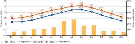 從氣候圖可以得知,福岡地區在夏天的天氣跟台灣其實差不多,很適合出國旅遊。(我喜歡夏天出國因為可以輕裝出遊,不用大包小包,也可以裝比較多特產回來)